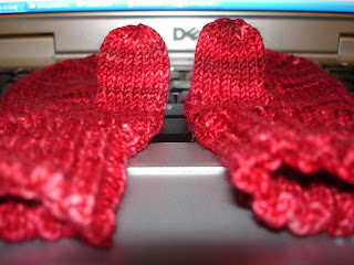 Calvin mittens. Fleece artist sock yarn and size 2 double-points. (Is there any other size?) 16 stitches times maybe 8 more rounds. They've been sitting here like this for at least three days. Maybe more. I just can't finish them. It's taking longer to write a post about them than it would actually take to just finish them. Seriously. I'd rather sit here and write nonsense and gibberish about not finishing silly mittens than sit and finish knitting them. You're probably not even reading this far anyway. This paragraph is much too long by now. You just looked at the picture, read the first couple of sentences, and snickered to yourself about how that silly drunken monkey never finishes anything. You've already clicked on to the next knitting blog on your list. That's okay, though. I forgive you. I know you were hoping for more than just an unfinished pair of mittens today. Maybe tomorrow.